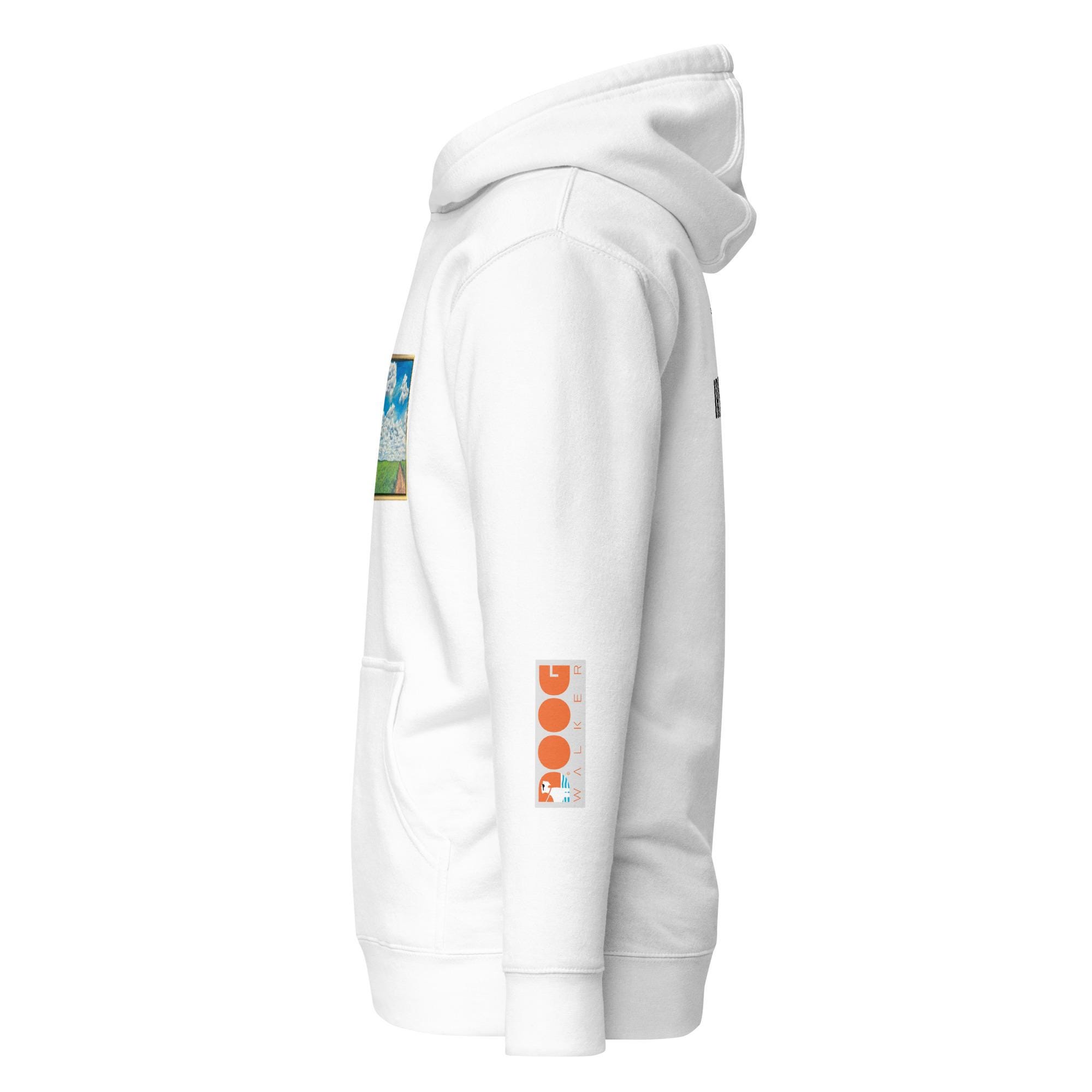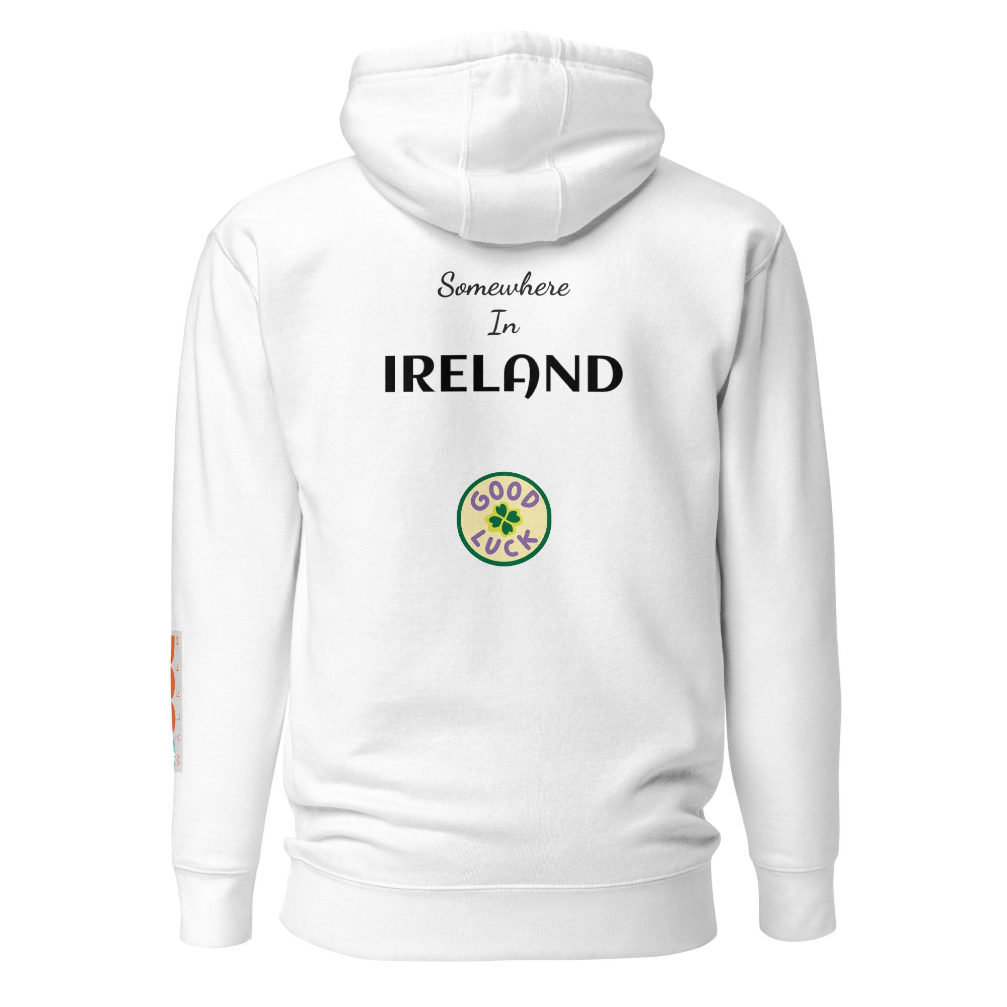 This hoodie is emblazoned with an original painting by Isabella frame and all. You are literally wearing art! The painting is of a wide expanse of electric blue sky filled with rolling white clouds. Beneath this seemingly endless sky is an expanse of emerald green grass and a small road leading to somewhere. The back of the Hoodie says, "Somewhere in Ireland" and has a small clover that says good luck. This is a truly one of a kind hoodie to help you remember your trip to Ireland or to help you look forward to your trip to Ireland!