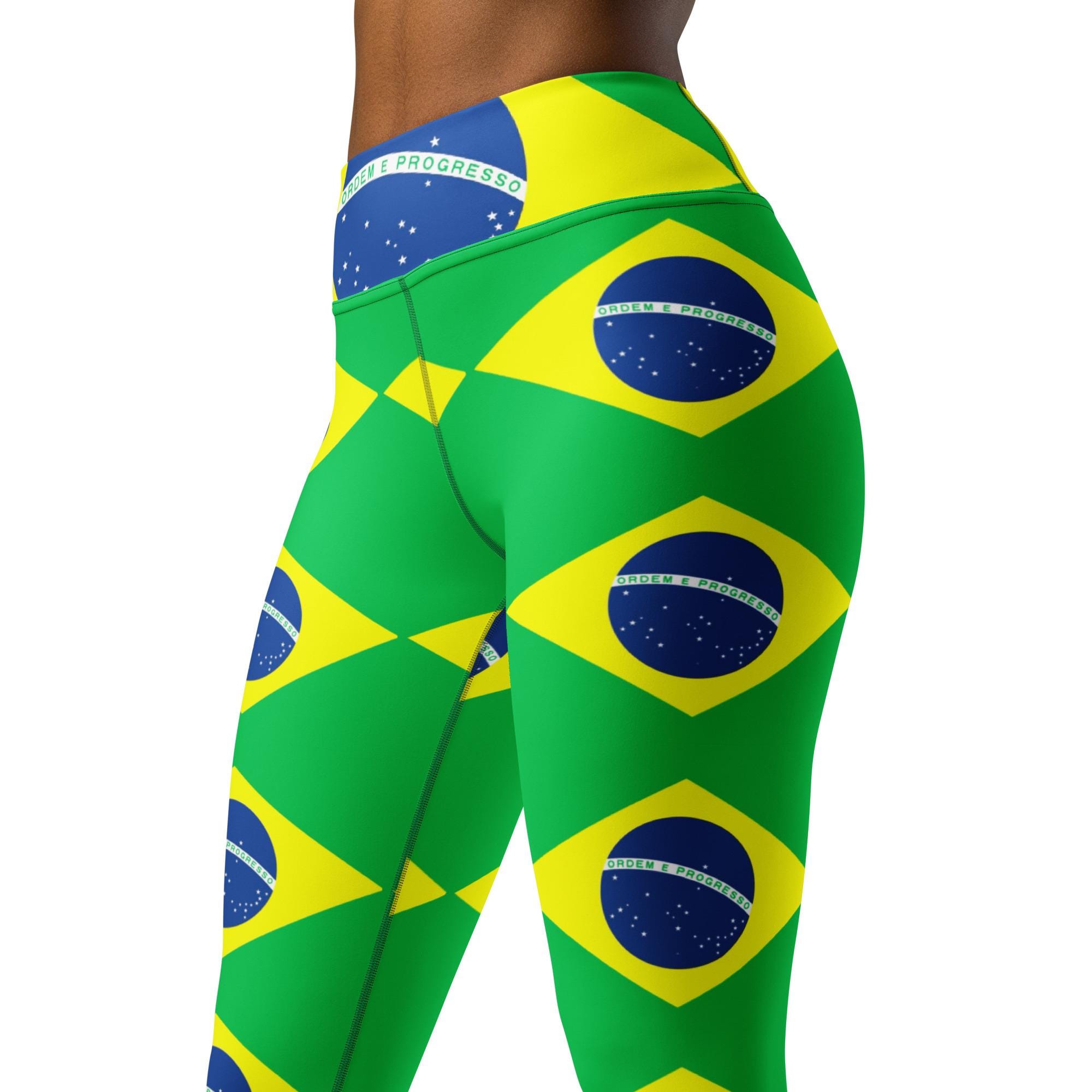 Super soft, stretchy, and comfortable yoga leggings. Leggings are printed with Brazilian Flag in a repeating pattern. The waist has another Brazilian flag but much larger which gives the feeling of a sash or a belt. You will be comfortable, stylish and patriotic while wearing these yoga pants. Order these to make sure your next yoga session is the best one ever! Bringing new meaning to HOT YOGA & BBL... we will see you in class!
