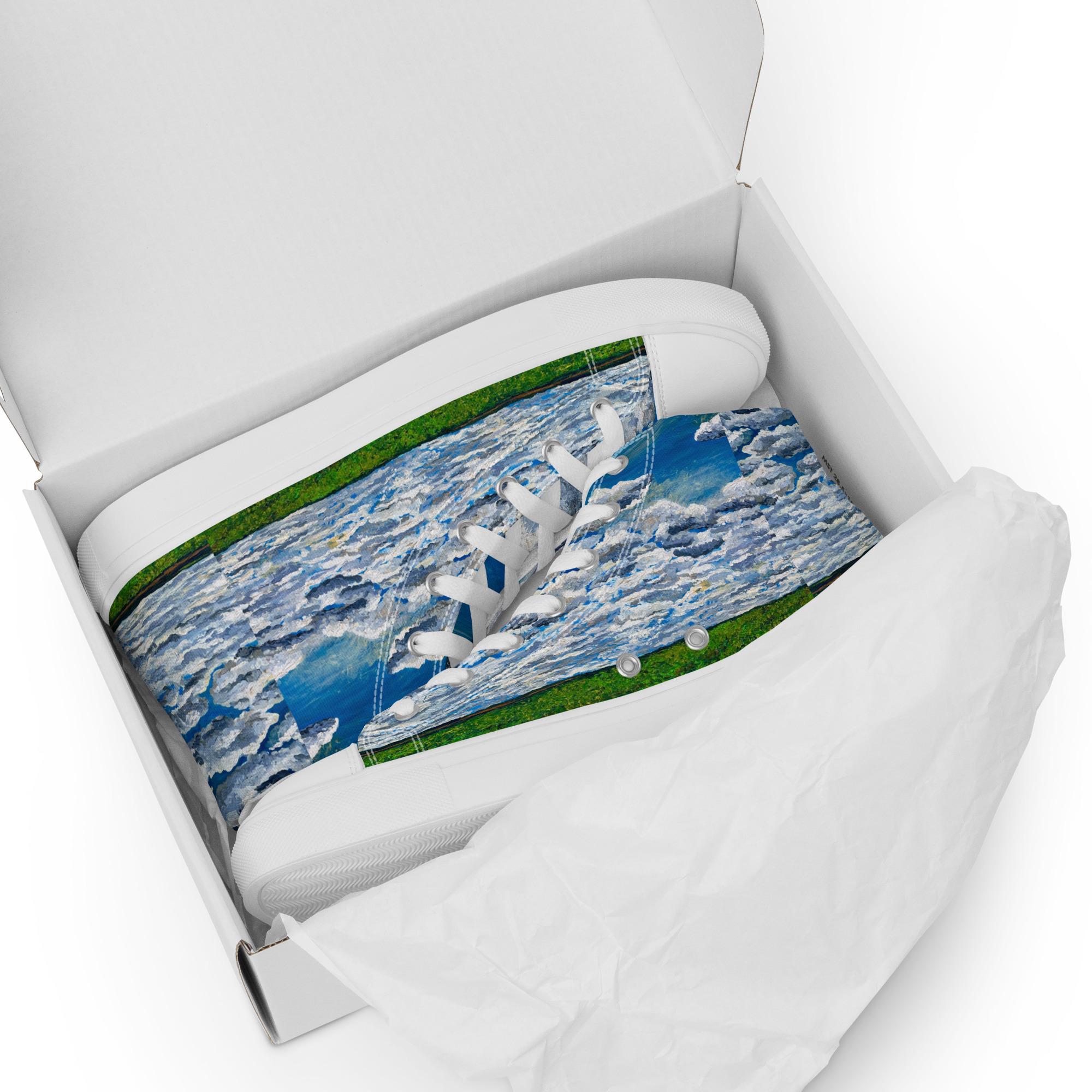 These high-top canvas sneakers feature an original oil painting depicting a wide horizon — rolling green grass below and an expansive sky filled with soft, fluffy clouds above. The composition captures the feeling of space, calm, and freedom, turning fine art into a wearable statement.