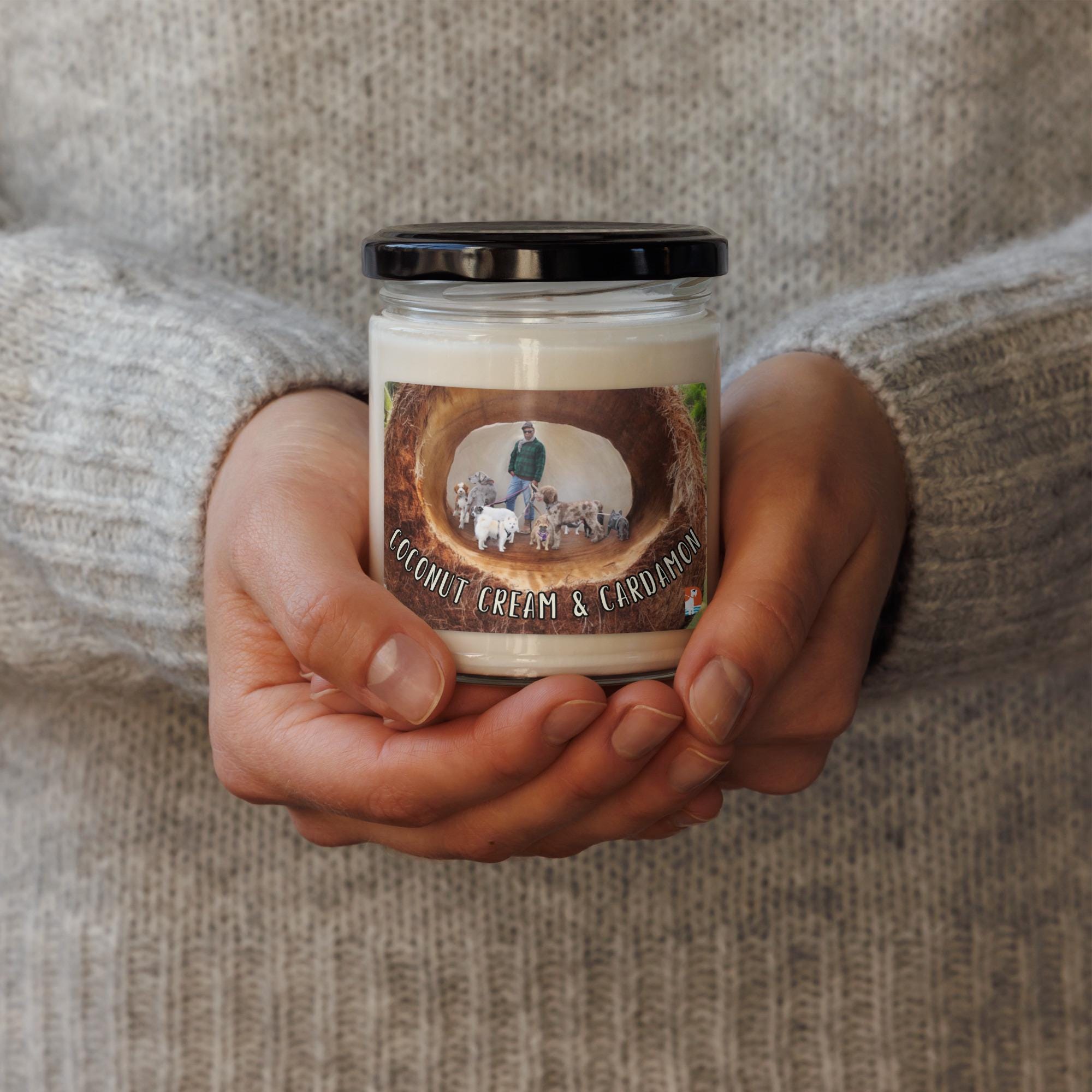 Give the gift of The Doog Walker this holiday season with this delightful coconut cream and cardamon scented candle with an image of dog's dogs standing inside a coconut shell. It will be the delight of anyone who receives it!